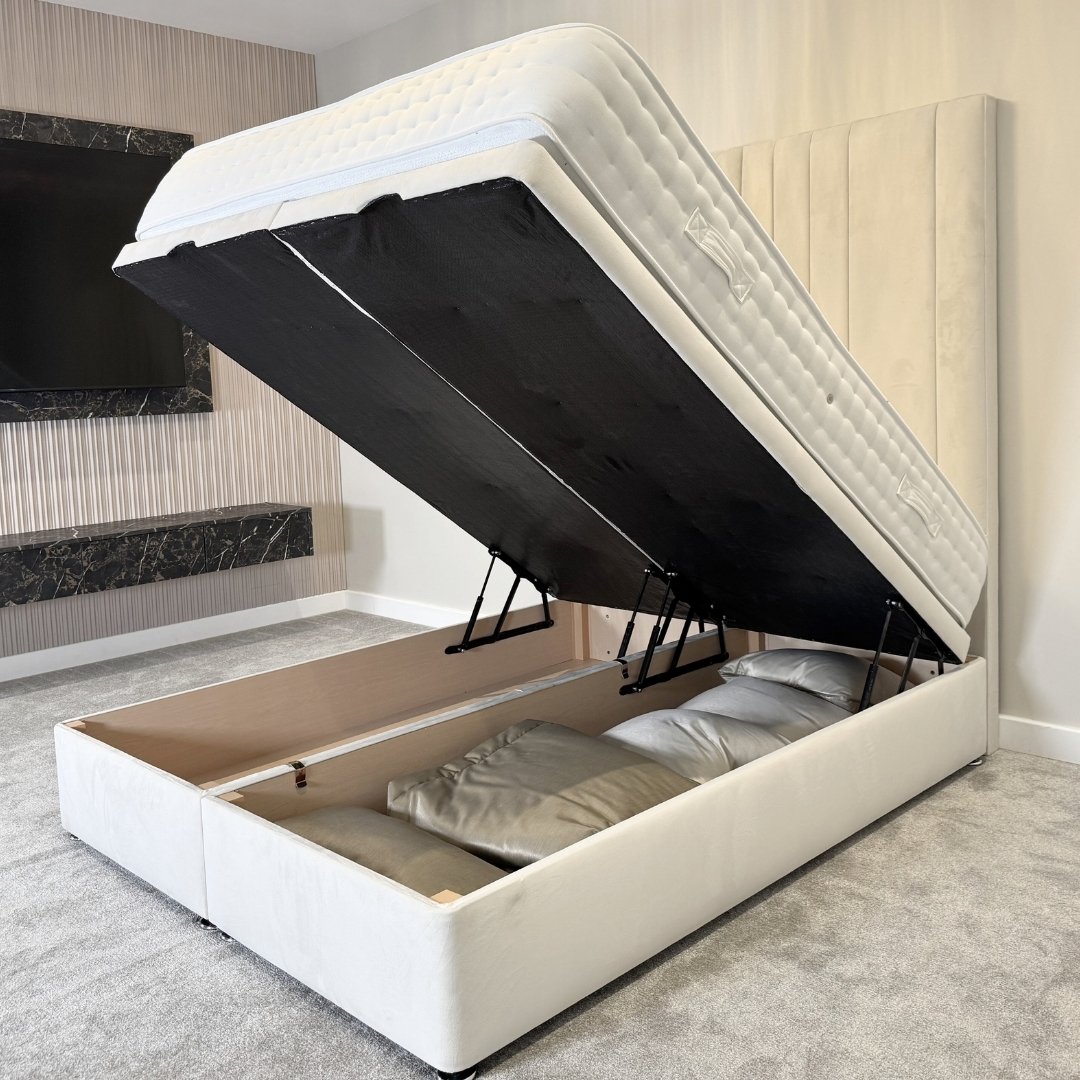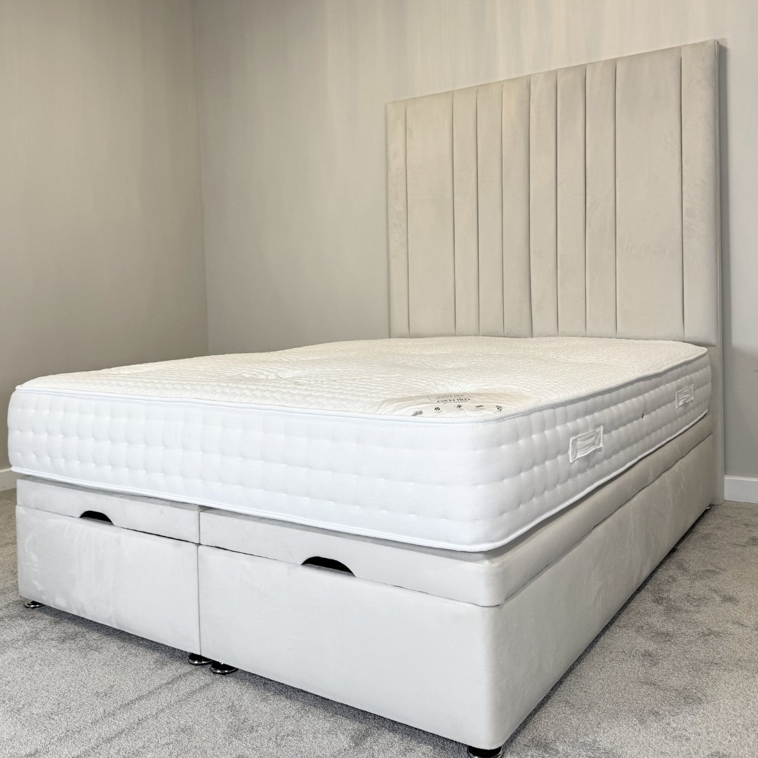 The Bellagio Ottoman Bed features a tall panelled headboard with a flush-fit end-lift ottoman base for refined style and hidden storage.