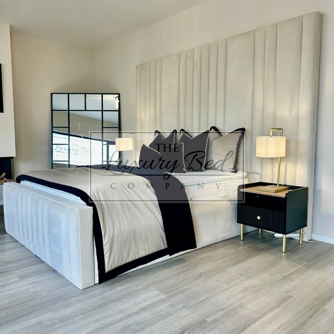 Chunky, low side rails keep the look grounded, while the tall footend repeats the same panelled detailing for a cohesive, fully upholstered finish. Optional lift-up storage can be added to keep your space organised without interrupting the design.