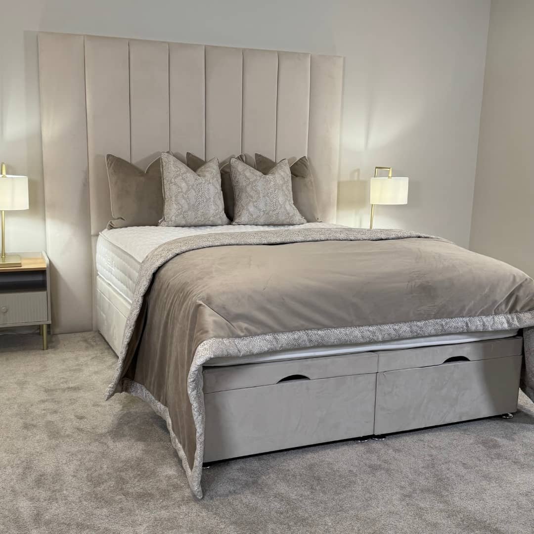 The Merry Ottoman Bed brings the distinctive Merry headboard together with generous, hidden storage in a clean, space-efficient format. The headboard remains the focal point, featuring bold panelled detailing that gives the design depth, structure, and a confident presence within the room.