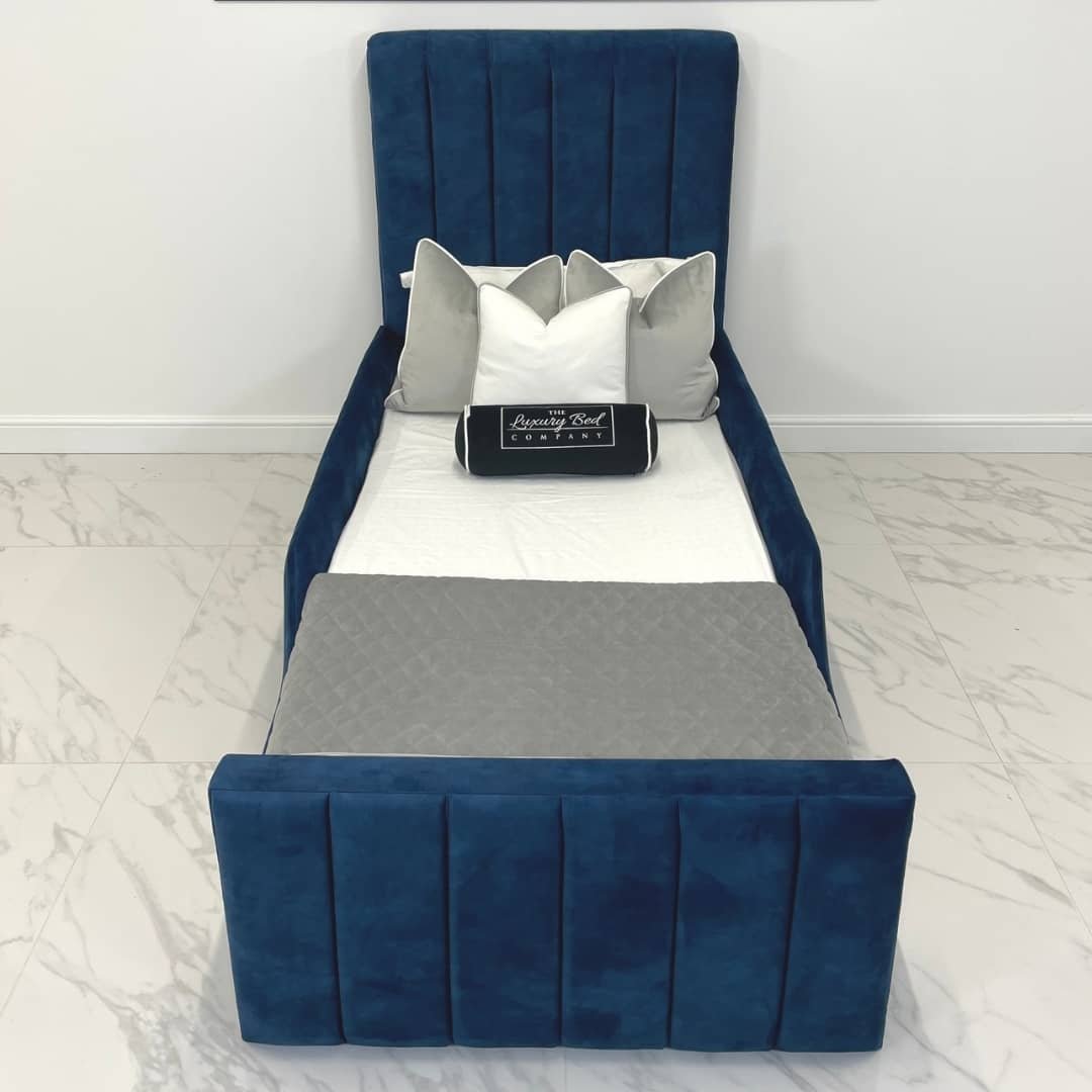 A high footend continues the same vertical lined detailing for a balanced, cohesive look. Built-in safety side rails run neatly along each side to help prevent rolling out of bed, giving parents extra peace of mind. Handmade to order in any size and fabric and colour finish, the Sienna Kids Bed brings lasting comfort and timeless style to any childโs room.